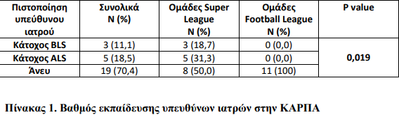 Όπως φαίνεται στον παραπάνω πίνακα από την σύγκριση των δύο κατηγοριών, παρατηρείται διαφορά στατιστικά σημαντική στο επίπεδο εκπαίδευσης των υπεύθυνων ιατρών στην ΚΑΡΠΑ.