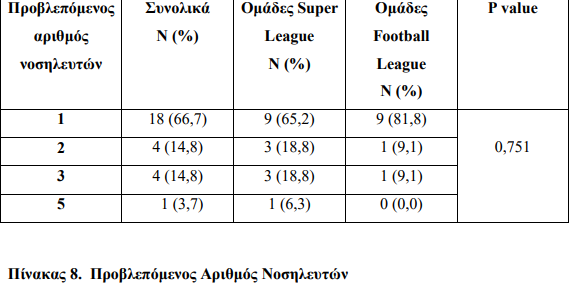 Στον πίνακα 8 φαίνεται ο προβλεπόμενος αριθμός νοσηλευτών, όπως προκύπτει από τις οδηγίες της ΕΚΕ βάσει της χωρητικότητας των σταδίων.
