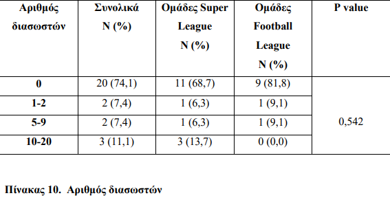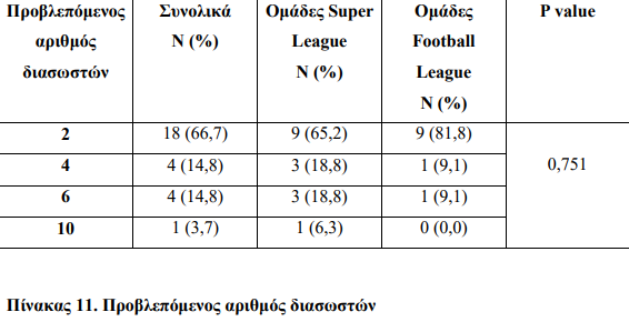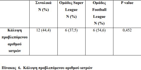 Από τον παραπάνω πίνακα προκύπτει ότι συνολικά 5 ομάδες από αυτές που συμμετείχαν στην έρευνα (ποσοστό 18,5%) καλύπτουν τον προβλεπόμενο αριθμό διασωστών, ενώ δεν καταγράφεται στατιστικά σημαντική διαφορά κατά τη σύγκριση των ομάδων Super League και Football League.