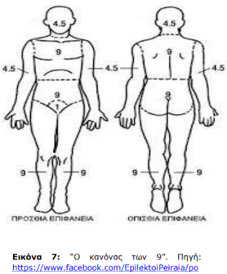 Για να είναι επιτυχής η θεραπεία ενός εγκαύματος θα πρέπει να γίνει άμεσα η πρώτη θεραπεία που εξαρτάται από την εκτίμηση της σοβαρότητας του εγκαύματος. Αυτό επιτυγχάνεται μέσω μιας μεθόδου που ονομάζεται κανόνας των εννιά, όπου ο νοσηλευτής καλείται να αναγνωρίσει την έκταση , το βάθος, και την θέση του εγκαύματος.