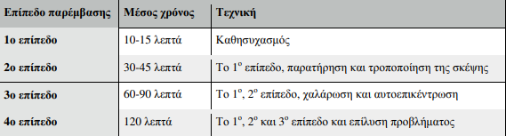 Ανάλογα µε το χρόνο που έχει διαθέσιµο, ο ειδικός της ψυχικής υγείας µπορεί να εφαρµόσει διάφορες τεχνικές παρέµβασης. Μια ενδεικτική ταξινόµηση των τεχνικών παρουσιάζεται στον παρακάτω πίνακα.