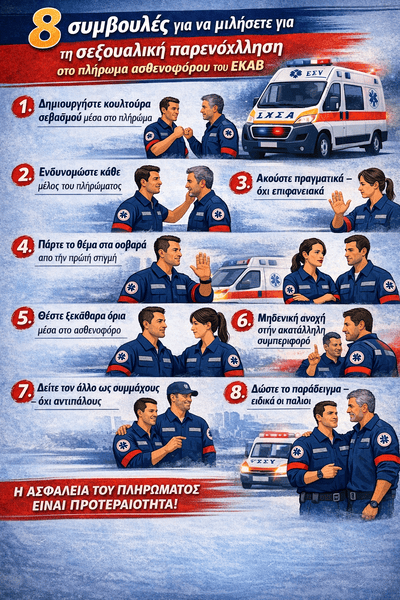 Στο ΕΚΑΒ, όπως και σε κάθε επιχειρησιακό οργανισμό πρώτης γραμμής, η καθημερινότητα δεν είναι ποτέ «εύκολη». Πίεση, ένταση, βάρδιες, δύσκολα περιστατικά, κλειστοί χώροι συνεργασίας. Όλα αυτά ανεβάζουν τα επίπεδα στρες και, αν δεν υπάρχει σωστή κουλτούρα, μπορούν να δημιουργήσουν τοξικές συμπεριφορές. Το ζήτημα της σεξουαλικής παρενόχλησης δεν είναι θεωρητικό. Υπάρχει και επηρεάζει άμεσα τη λειτουργικότητα του πληρώματος και την ασφάλεια των ίδιων των διασωστών.