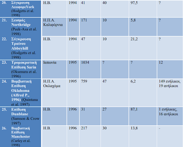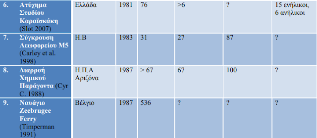 Στα 23 συμβάματα που αφορούσαν ατυχήματα υπήρχε η ακόλουθη κατανομή: 1 πυρκαγιά (Hart et al. 1975), 6 συμβάματα σε αθλητικές διοργανώσεις εκ των οποίων 2 σε στάδια (Slot 2007) (O’Byrne 1989), 1 σε αγώνα ταχυπλόων (Vukmir & Paris 1991), 2 σε αεροπορικές επιδείξεις (Dumas 2009) (Johnson 2012), 1 κεραυνός σε γήπεδο (Dollinger 1985), 1 μαζική δηλητηρίαση (Perry et al. 1998), 1 ναυάγιο (Timperman 1991), 1 συντριβή επιβατικού αεροσκάφους (van Amerongen et al. 1993), 3 συγκρούσεις τραίνων (Hodgetts et al. 1998), 9 τροχαία ατυχήματα με λεωφορεία (Lewis et al. 1980) (Carley et al. 1998) (Wass et al. 1994) (Hodgetts et al. 1998) (ΑΣΤΥΝΟΜΙΚΗ ΔΙΕΥΘΥΝΣΗ ΛΑΡΙΣΑΣ 2003) (BBC GREEK 2003) (Lyon & Sanders 2012) και 2 διαρροές τοξικών χημικών (Cyr C. 1988) (Timm & Reeves 2007).