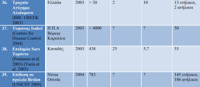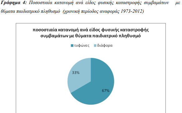 Τα συμβάματα που οφείλονταν σε φυσικές καταστροφές ήταν 9 (18% του συνόλου): 1 σεισμός (Peek-Asa et al. 1998), 6 τυφώνες (Beven & Kimberlain 2009) (Berg 2009) (Callaghan et al. 2007) (Stewart 2004) (CDC 2012), 1 πλημμύρα (Gnauck et al. 2007), και 1 επιδημία από SARS (Poutanen et al. 2003) (Varia et al. 2003). Για λόγους που εξυπηρετούν τους σκοπούς της παρούσης μελέτης επιλέξαμε να συμπεριλάβουμε μια  κεραυνοπληξία σε γήπεδο στα ατυχήματα σε αθλητικές δραστηριότητες και όχι στις φυσικές καταστροφές. Στην κατηγοριοποίηση διάφορα στο γράφημα 4 περιλαμβάνονται 1 σεισμός (Peek-Asa et al. 1998), 1 πλημμύρα (Gnauck et al. 2007), 1 επιδημία (Varia et al. 2003).