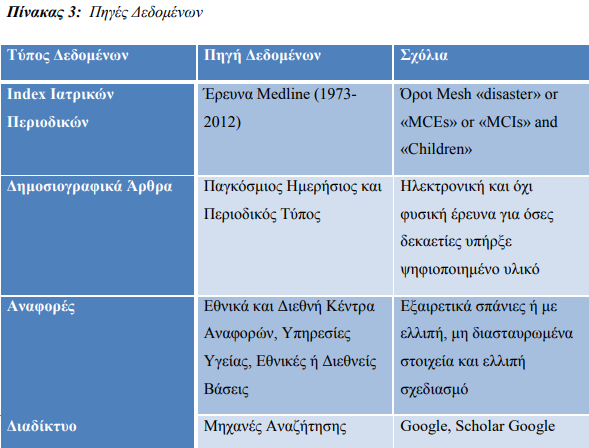 Η δημιουργία ενός καταλόγου συμβαμάτων με πολλαπλές απώλειες υγείας σε παιδιατρικά θύματα σε παγκόσμιο επίπεδο κατά τις 4 τελευταίες δεκαετίες (1973-2013). Ο σχεδιασμός μίας βάσης συλλογής δεδομένων για ανάλογα στοιχεία και πρόταση υλοποίησης και εφαρμογής της. Α.4.3 Μέθοδος Συμβάματα με μαζικές απώλειες υγείας και παιδιατρικούς ασθενείς εντοπίστηκαν μέσω μίας έρευνας MEDLINE, ηλεκτρονικής έρευνας σε παγκόσμιο ημερήσιο και περιοδικό τύπο, έρευνα σε αναφορές εθνικών κέντρων και λοιπών διαδικτυακών μηχανών αναζήτησης. Ο πίνακας 3 περιλαμβάνει τις πηγές από όπου αναζητήθηκαν δεδομένα