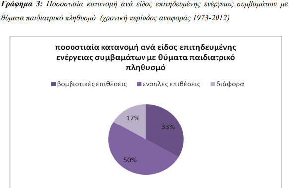 Γεγονός είναι ότι συγκεκριμένοι τύποι συμβαμάτων, όπως επιθέσεις σε σχολεία, έχουν δυσανάλογα αυξημένο ποσοστό παιδιατρικών απωλειών σε σχέση με άλλα. Η μέση τιμή παιδιατρικών απωλειών για τα 33 συμβάματα ήταν 54% (5,7-100) χωρίς όμως να μπορεί να αποτελέσει ένδειξη για την εξαγωγή συμπερασμάτων.